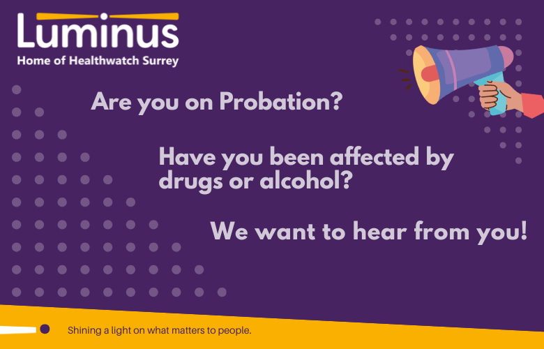 Our wider Luminus team are wanting to hear from people on probation who have been affected by drugs or alcohol. If you live in Surrey, are 18+ and have been on probation in the last 2 years they want to hear from you.